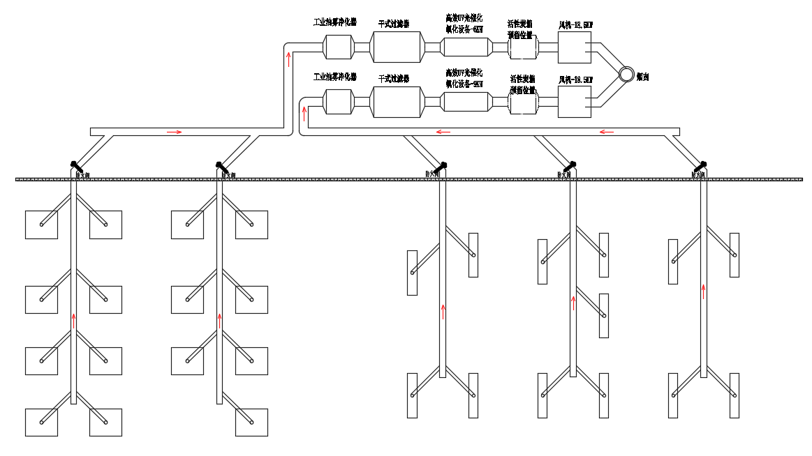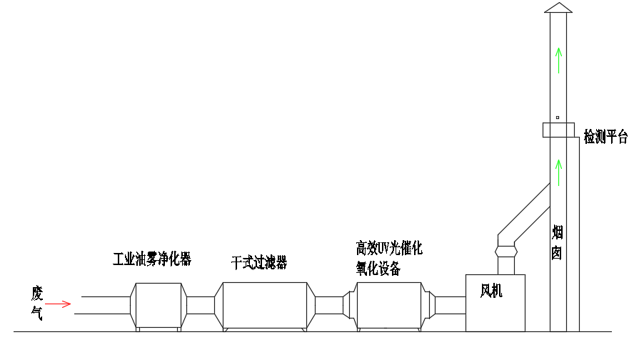 处理工艺:废气收集+工业油雾净化器+干式过滤器+UV光催化氧化设备+引风机,风量设计24000m³/h。